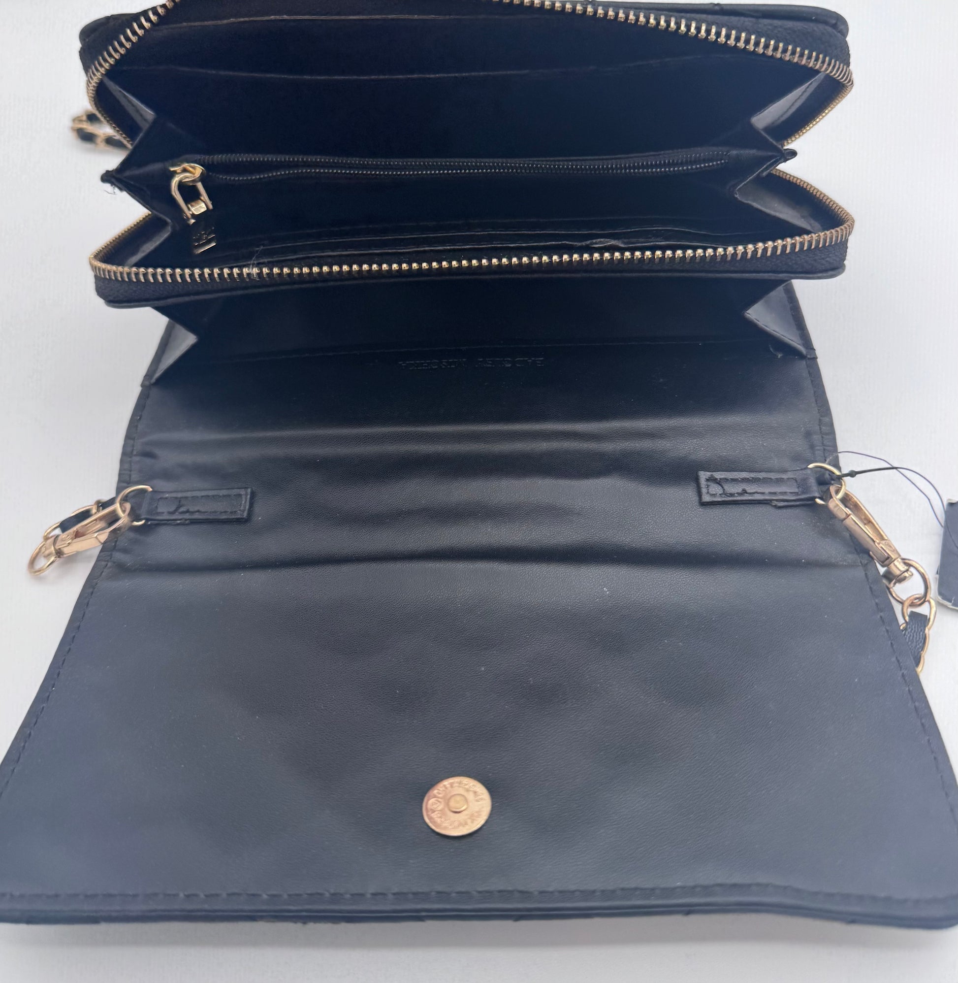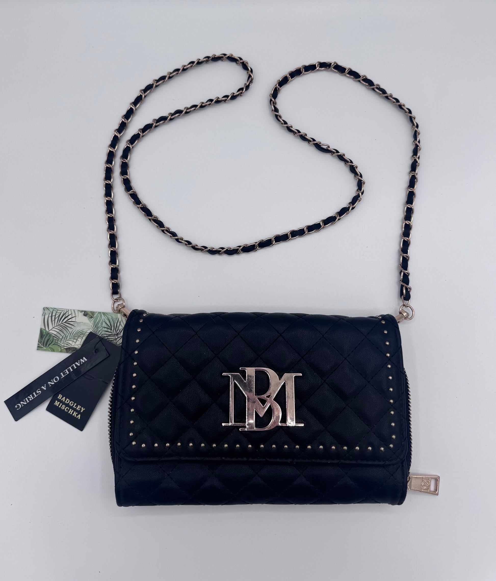 - Black and gold chain crossbody strap that can be detached